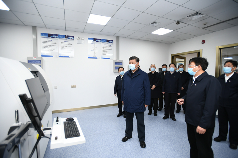 10月22日下午,中共中央总书记、国家主席、中央军委主席习近平在山东省济南市主持召开深入推动黄河流域生态保护和高质量发展座谈会并发表重要讲话。这是座谈会前,习近平21日下午在东营市胜利油田勘探开发研究院二氧化碳气驱实验室考察自主创新情况。新华社记者 李学仁 摄