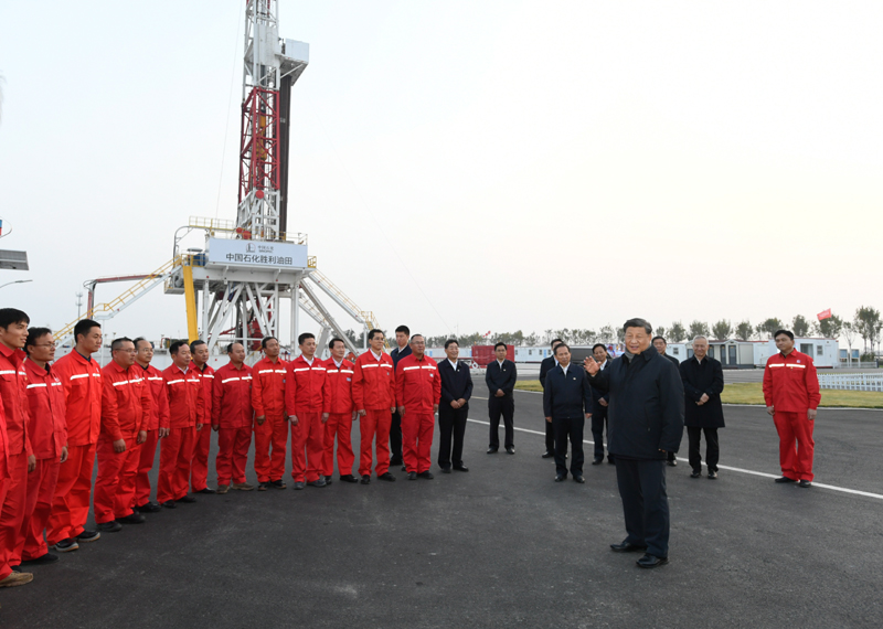 10月22日下午,中共中央总书记、国家主席、中央军委主席习近平在山东省济南市主持召开深入推动黄河流域生态保护和高质量发展座谈会并发表重要讲话。这是座谈会前,习近平21日下午在位于东营市莱州湾的胜利油田莱113区块考察时,登上二层钻井平台,察看钻井自动化设备。新华社记者 李学仁 摄